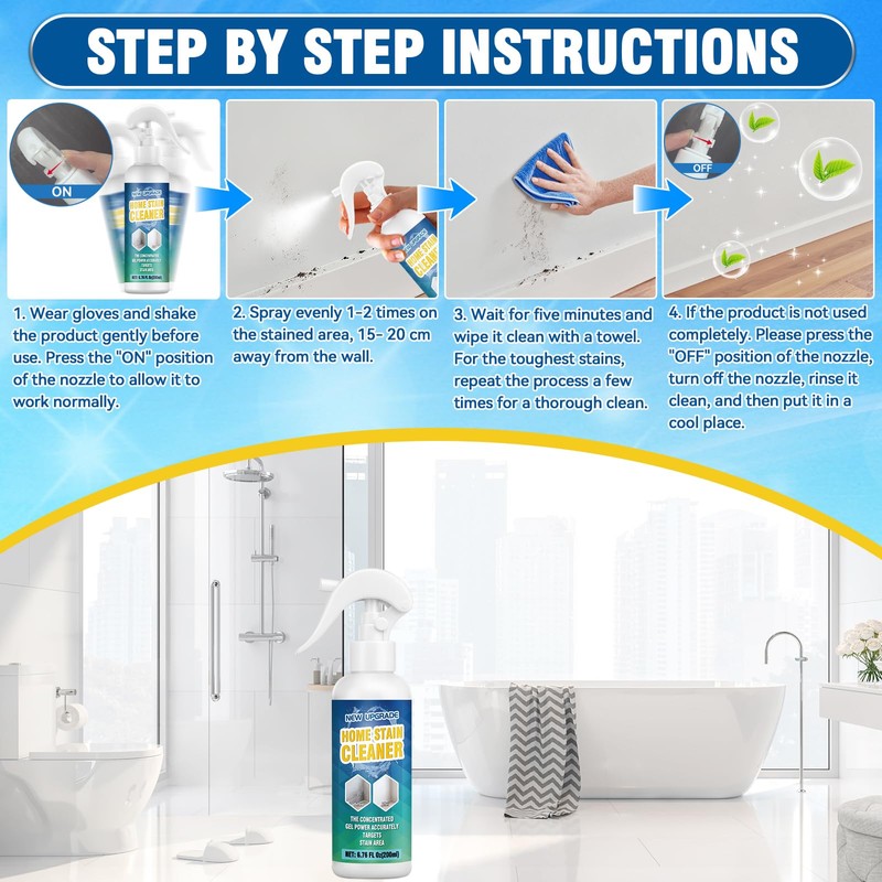 - Easy to Use: Transform your home in simple steps. First, ventilate the area and wear gloves. Second, press the home stain cleaner’s switch and spray onto the stained surface. Third, wait 5-10 minutes. Fourth, wipe with a damp cloth or wet wipe, and the task is complete. For optimal results, repeat 1-2 times as needed