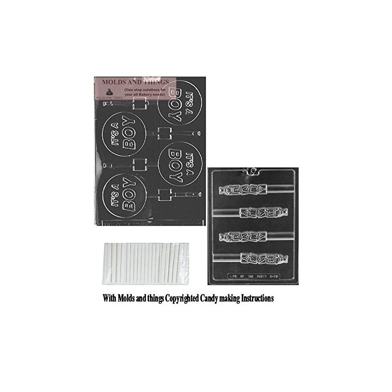 MOLDS AND THINGS It's A BOY Lolly Chocolate Candy Mold, Baby Block Pretzel Chocolate Candy Mold with Copywrited Candy Making Instruction + 50 Sticks