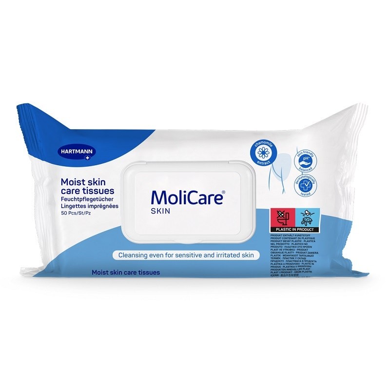 MoliCare Skin Moist Skin Care Tissues are quick and gentle cleansing wipes for areas affected by incontinence. Extra large and extra soft cleansing wipes for incontinence help maintain the skin's pH and natural protective layer.