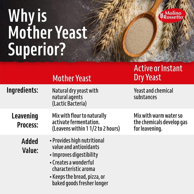 - EASY TO USE: Just mix Molino Rosseto Mother Yeast directly with flour (no need to pre-hydrate) and allow 1 ½ to 2 hours for leavening. To substitute with Active or Instant dry yeast, simply triple the amount the recipe calls for.