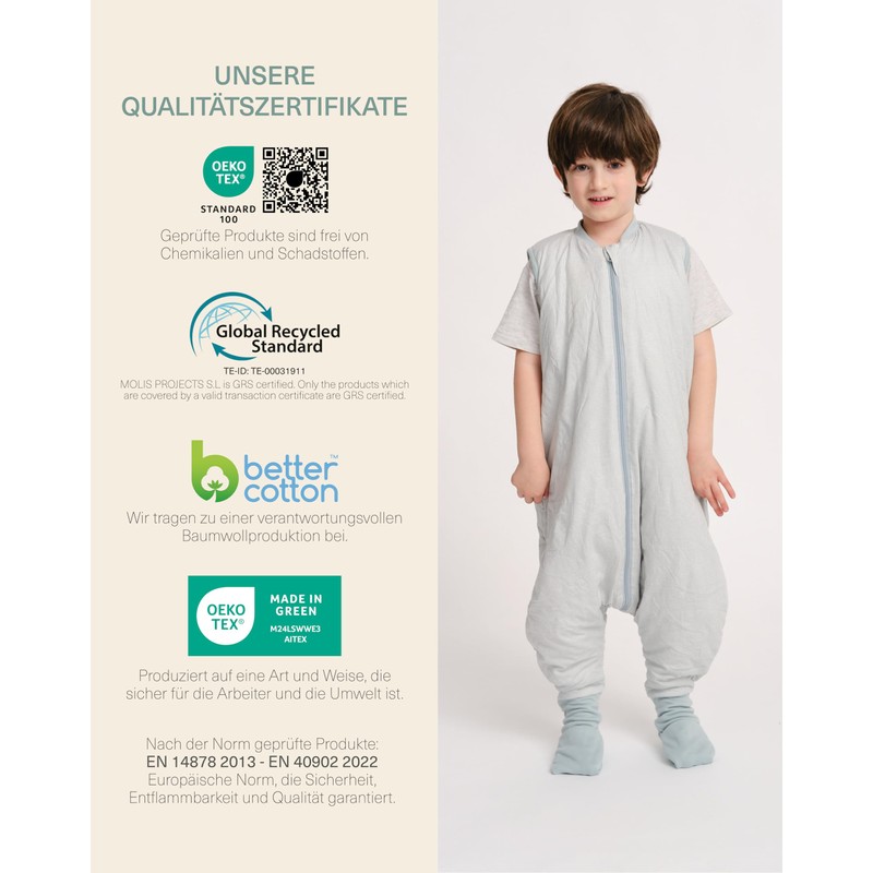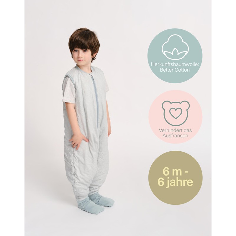 - Warm feet: Our baby sleeping bag with feet 1 tog is a lightly lined garment that is worn over pyjamas and keeps your child warm. The sleeping bag 1 tog with non-slip socks completely cover your child's feet and are very easy to put on and take off. The silicone dots on the sole of the foot prevent your baby from slipping while walking, providing more protection and safety.