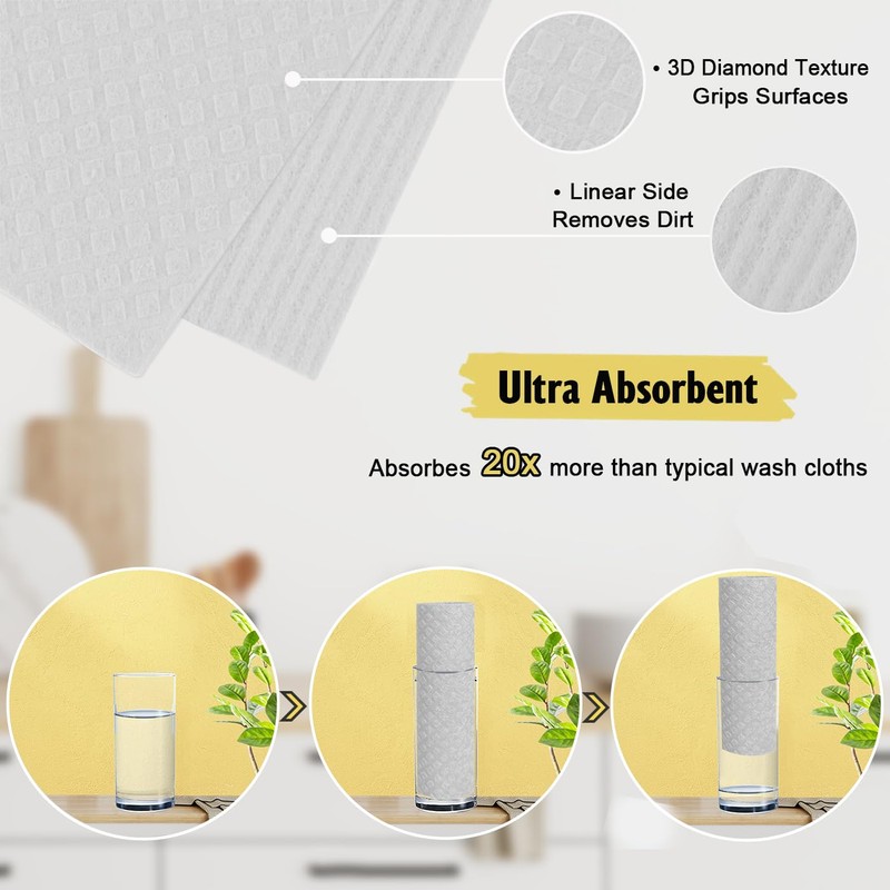 - 【Super Absorbent】Absorbing 20 times more liquid than its weight! Perfect for wiping surfaces, washing dishes and mopping up spills as well as using for the kitchen, bathroom, office and car.