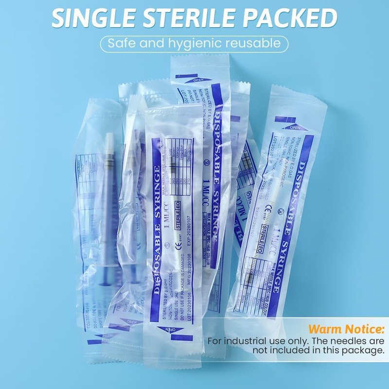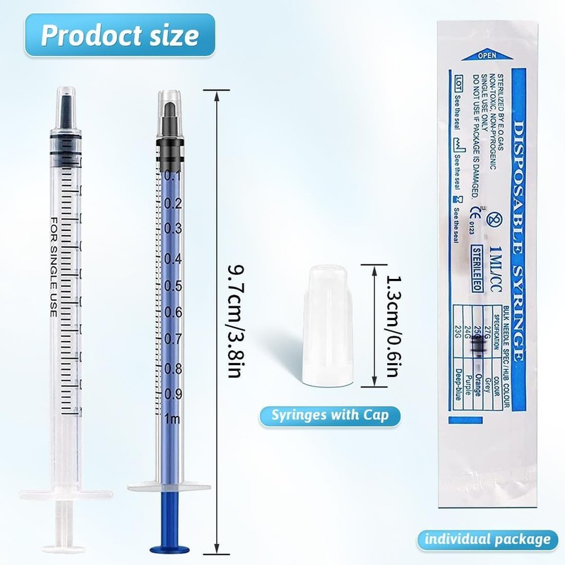 - 50Pcs 1ml Plastic Syringes with caps,no needle,quantities enough for use or replacement.Each 1ml syringe comes with a cap and individually wrapped, safe and sterile.