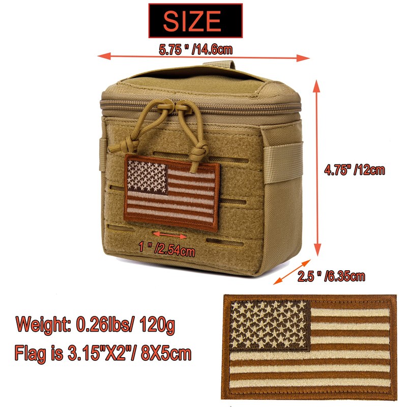 - FRONT LASER-CUT LOOP : Tactical molle pouch have 9 pcs laser cut hole . Molle platform for storing additional tools, mounting memorable patches, adding customization/tactical ID, attaching additional MOLLE gear. Adding our free flag patch will makes it more conspicuous and fashionable