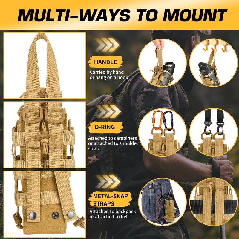 Versatile Mounting Options: Attach our bottle holder any way you like! Use metal-snap straps to mount it on your backpack, vest, or belt. Connect it to gear or vehicles with the built-in D-rings and carabiners (The product does not include carabiners). Or simply carry it by the strong nylon handle.
