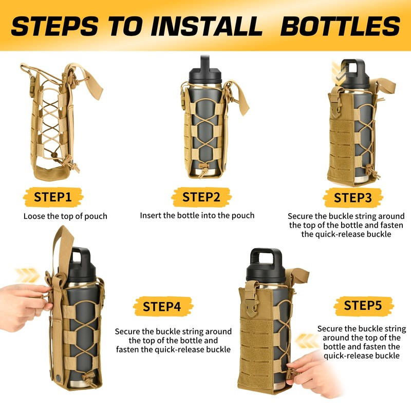 - Adjustable for 16- 64oz Bottles: Our tactical bottle holder fits a wide range of bottles from 16 oz to 64 oz . The flexible design accommodates bottles up to 3.94" in diameter and 11" in height. Whether you're carrying a small water bottle or a large thermos, this holder keeps your drink secure and accessible.