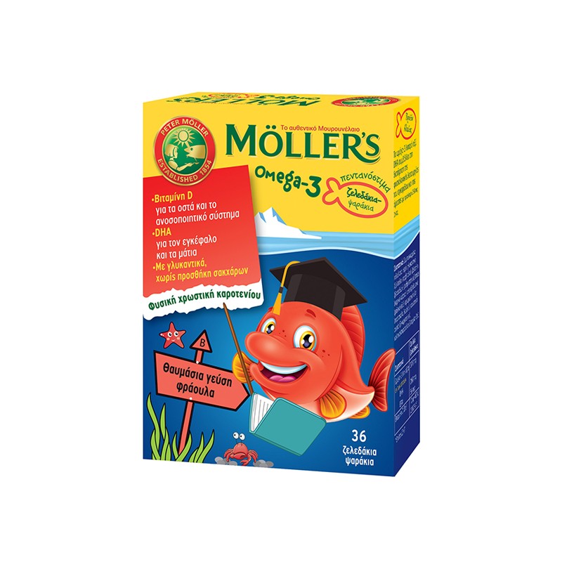 Moller's Omega-3 Kids is a food supplement specifically designed for children. Ideal for children who find it difficult to swallow cod liver oil, in soft chewy jellies-fishes with a pleasant fruity taste (orange-lemon). It is rich in omega-3 fatty acids and natural vitamin D.