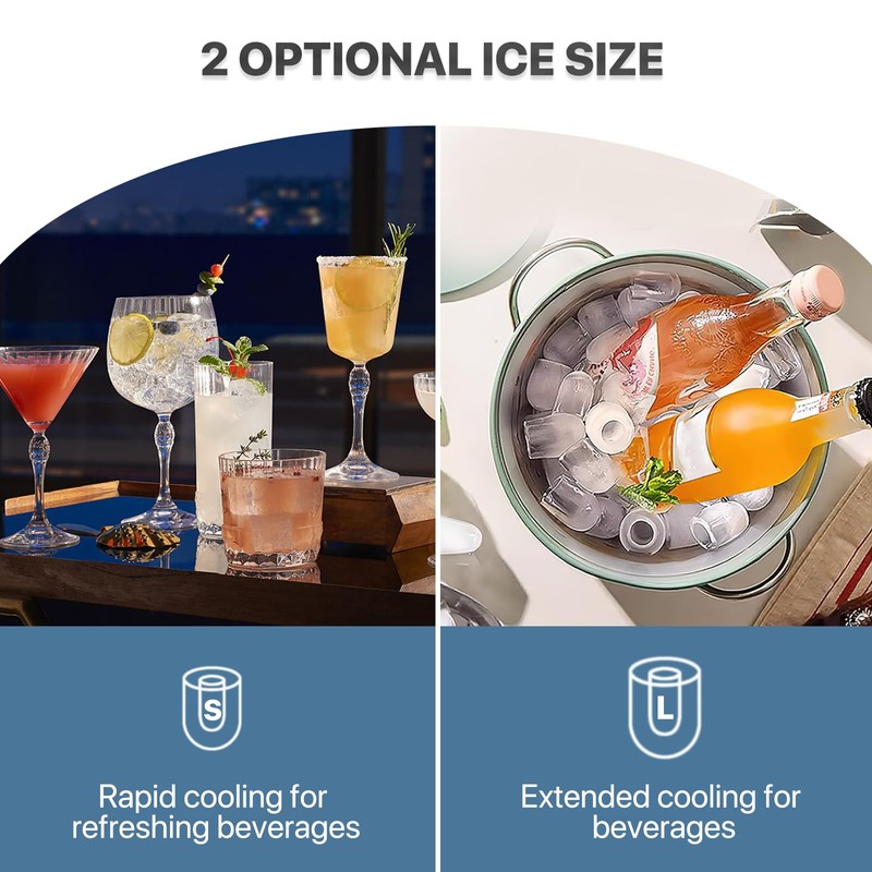 - 2 Ice Cube Sizes - This compact ice maker countertop produces 2 sizes of bullet-shaped ice cubes, allowing you to choose the right cube for your favorite drinks. Large ice cubes are ideal for strong drinks such as whiskey and other spirits. Small ice cubes chill your drink quickly and are perfect for beverages that require instant cooling.