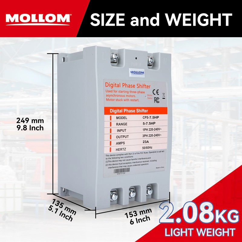 MOLLOM 3 Phase Converter, Digital Phase Shift 5.5KW 7.5HP 23Amps 220-240V, Single to Three Phase Converter for 3PH Motors, Automatic Restart to Protect Motor from Blocking