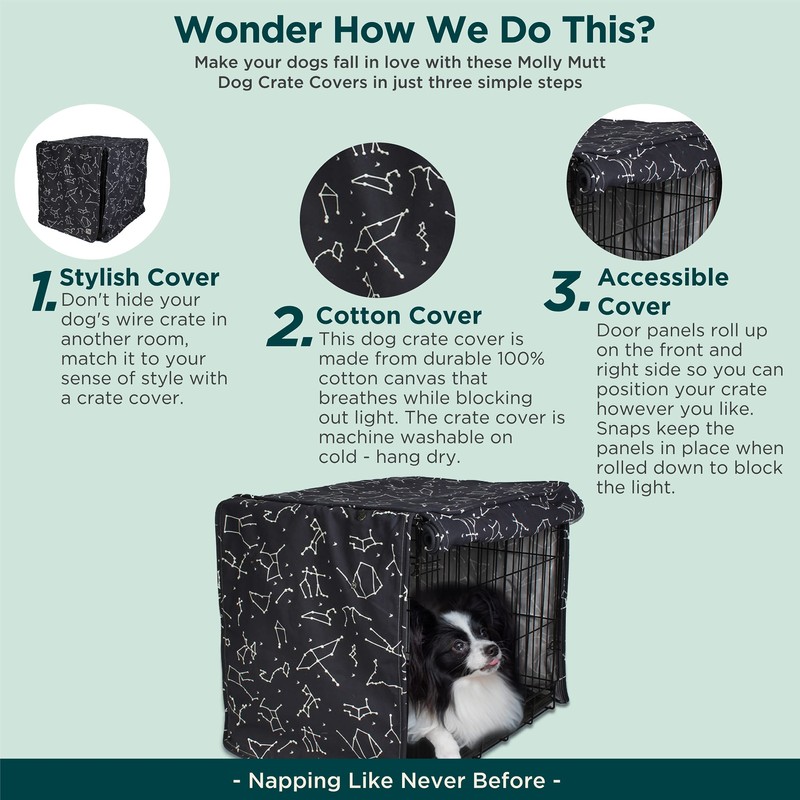- Dog Crate Cover - Don't hide your dog's wire crate, match it to your sense of style with a Molly Mutt crate cover; This dog cage cover measures 36" x 24’" x 27", and features our stylish Rocketman print