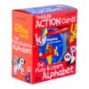 - Play, laugh and move with your child as they learn their ABCs! Start with the upper case letter cards. Say the letter, name the object, and then ask your child to perform the action described on the card. Do the actions together! A bonus prompt on each card provides more opportunities for pretend-play, movement, and conversation. Turn over the cards to learn lower case letters and keep the fun going!