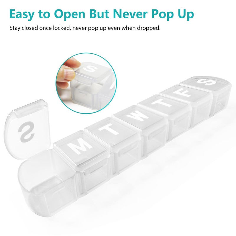 - Practical Design & Easy to Use: Easy to open even with finger arthritis, friendly for elderly or arthritic patients. The pill container will stay closed once locked, the lids would never pop up even when dropped, will keep your pills safe all the way.