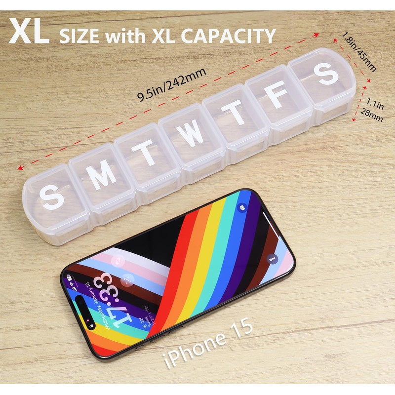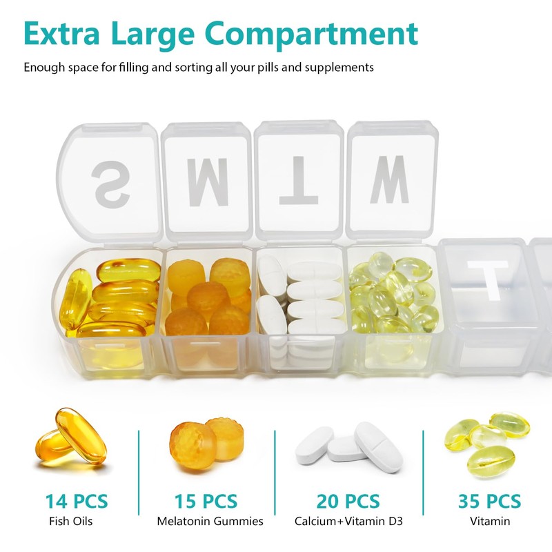 - Extra Large Capacity: There is no need to worry about the pill pack thing on the go. Our Jumbo pillcase have enough space for filling and sorting all your pills for seven day a week, it can hold 12 big fish oils or 12 big vitamins in each slots.