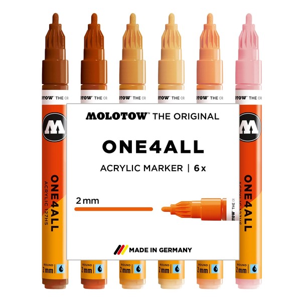 - Box contents: 6 acrylic pens with 2 mm line width in case in the colours hazelnut brown, lobster, ochre brown light, sahara beige pastel, peach pastel, powder pastel