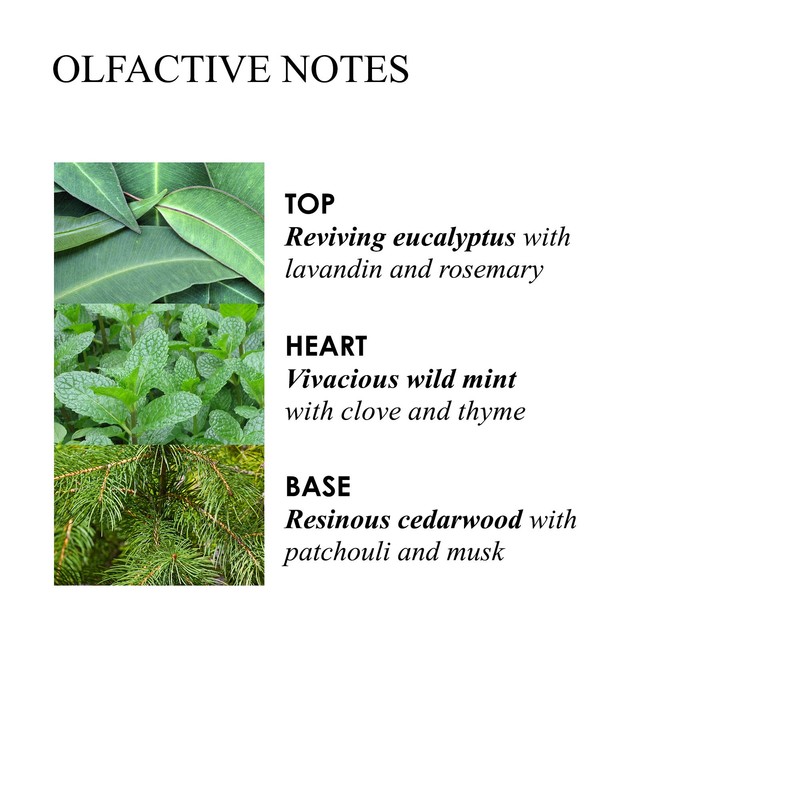 - The first deep breath in a soaring eucalypt forest. Clean, fresh notes of leafy eucalyptus, uplifting lavandin and rosemary flourish with herbaceous wild mint and thyme. An undergrowth of cedarwood adds a dry, warm character. Stimulate your senses, feel restored with a foray into aromatic woods