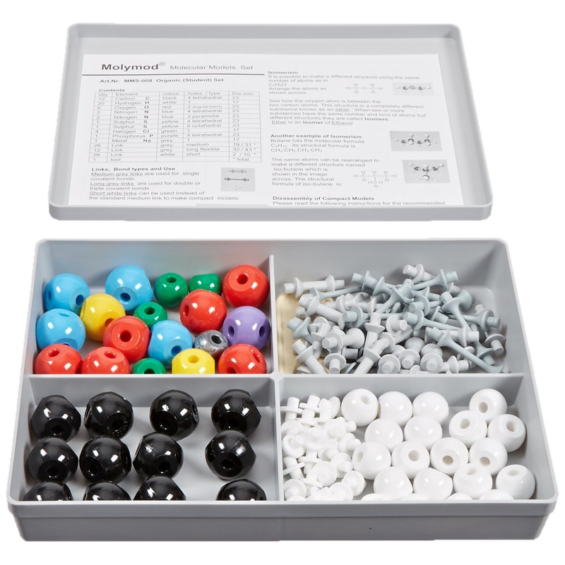 The Molymod MMS-008 organic chemistry molecular model set for students in grades 7-12 includes 53 color-coded plastic atom parts and 64 links in a storage box. This model set is used to demonstrate concepts of organic chemistry and functional groups such as alkanes, alkenes, alkynes, alky halides, alcohols, ethers, aldehydes, ketones, carboxylic acids, nitriles, amines, esters, aromatic compounds, and heterocyclic compounds. The atom parts and links for assembling models are made from durable plastic and are color coded to national standards for ease of identification. Atom parts range from 17mm to 23mm in diameter and represent carbon, nitrogen, oxygen, hydrogen, sulfur, phosphorus, halogen, and metal. It comes with 26 medium length grey links, 12 flexible long grey links, 26 short white links, one link remover tool, and instructions. The kit comes in a plastic box for ease of storage.Science education products incorporate applied math and science principles into classroom and homeschool-based projects. Teachers in pre-K, elementary, and secondary classrooms use science education kits and products alongside science, technology, engineering, and math (STEM) curriculum to demonstrate STEM concepts and real-world applications through hands-on activities. Science education projects include a broad range of activities, such as practical experiments in engineering, aeronautics, robotics, energy, chemistry, physics, biology, and geology.Spiring Enterprises manufactures molecular models for use in classrooms and educational settings under brands such as Molymod, miniDNA, and Molyorbital. Founded in 1967, the company is headquartered in Billingshurst, West Sussex, UK.What's in the Box?(14) Black tetrahedral carbon atom parts(6) Red 2-hole angular oxygen atom parts(20) White single-hole hydrogen atom parts(4) Blue nitrogen atom parts(2) Yellow sulfur atom parts: (1) tetrahedral, (1) octahedral: (1) Purple tetrahedral phosphorus atom part, (1) Purple trigonal bipyramidal phosphorus atom part(4) Green single-hole halogen atom parts(1) Grey single-hole metal atom parts(26) Medium-length 19mm grey links(12) Flexible long 30mm grey links(26) Short 2mm white links Link remover tool Storage box Instructions