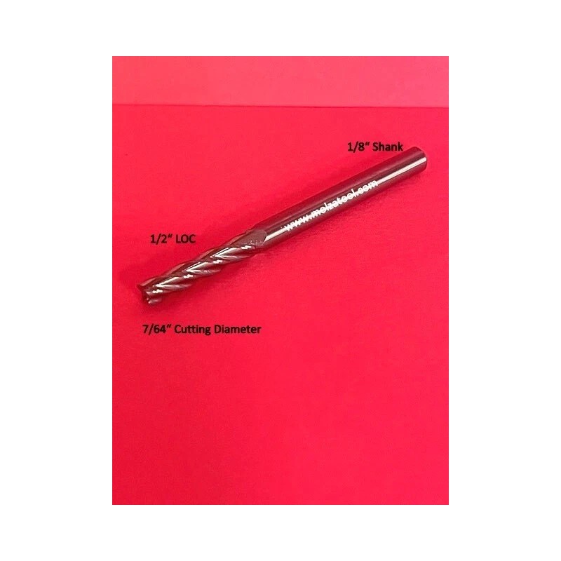 7/64" (+0-.002) Cutting Diameter, 1/2" Length of Cut, 1-1/2" Oal, Four-Flute, 1/8" Shank, Center-Cutting