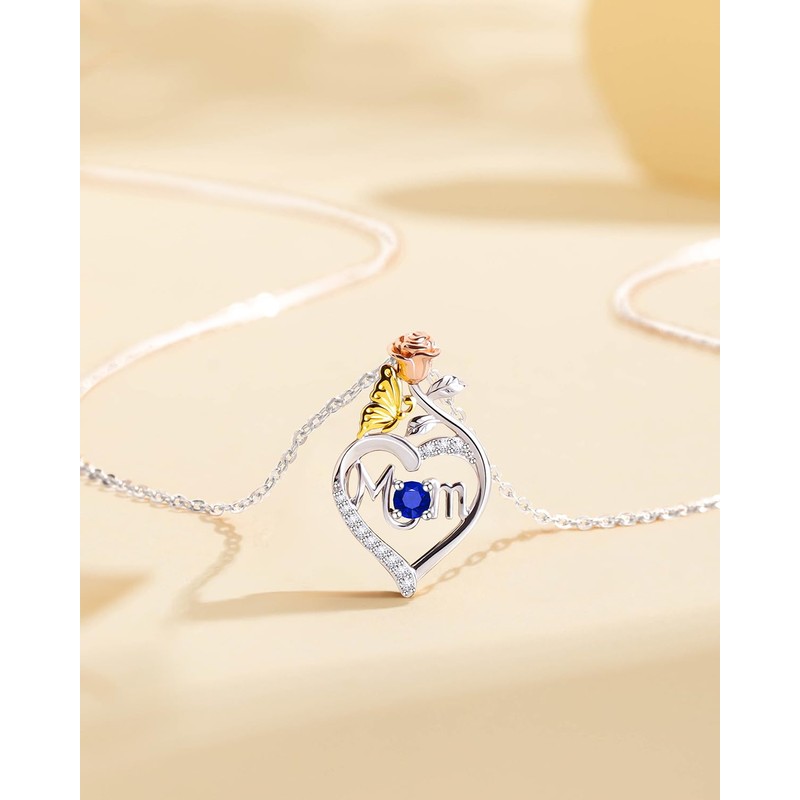 - Delicate Heart & Rose Design with Mom: Heart pendant accented with shimmering CZ, an elegant rose flower, and a butterfly symbolizing transformation. The sparkly birthstone is crowned by the word "Mom", creating a romantic and artistic design that makes this mom heart necklace timeless and charming