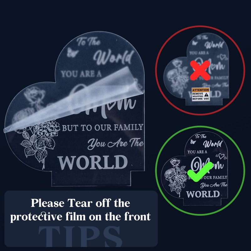 - - In order to protect the acrylic board, we have attached a protective sticker on the engraved side of the night light. Please tear off the protective sticker after you receive it.