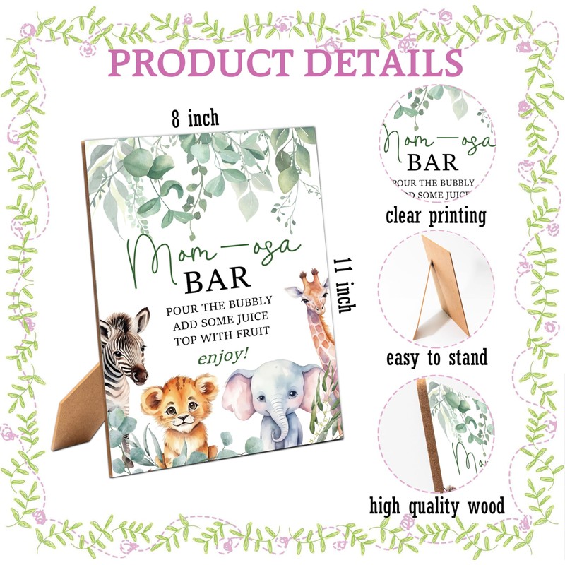 Mom-osa Bar Sign - Safari Jungle Baby Shower Sign, 1 Pack Wooden Sign with Stand, Gender Neutral Party Table Decor, Greenery Baby Shower Supplies (LB12)