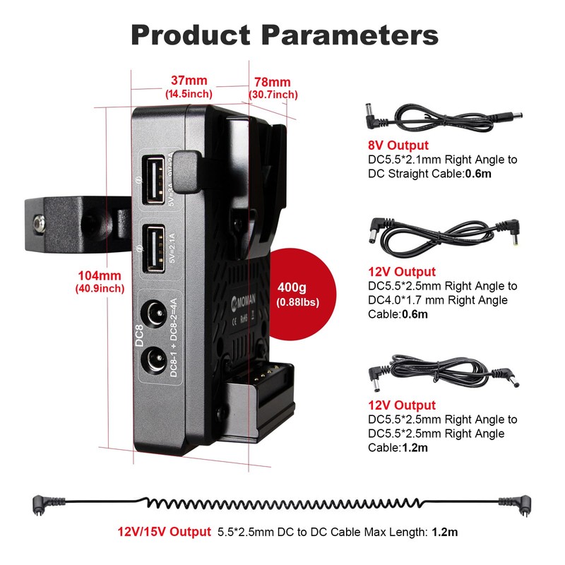 - 【Multiple Outputs Built】The well-made and sturdy mini V-mount battery plate adapter Moman MVBP-S is built with dual USB-C outputs & a 8V DC barrel output, a 12V DC barrel output & a 14.8V D-Tap output that can power up to 5devices such as camera, monitor, transmitter at the same time.