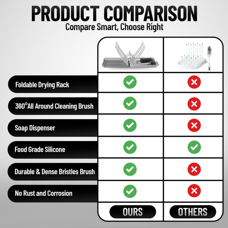 - 6-in-1 Travel Baby Bottle Cleaning Kit: This travel bottle cleaner kit Includes a 9.45" travel bottle brush with an extendable handle, nipple brush, straw brush, soap dispenser, drying rack & storage box. The travel bottle brush set ensures 360° deep cleaning of all bottles, sippy cups & breast pump parts.
