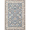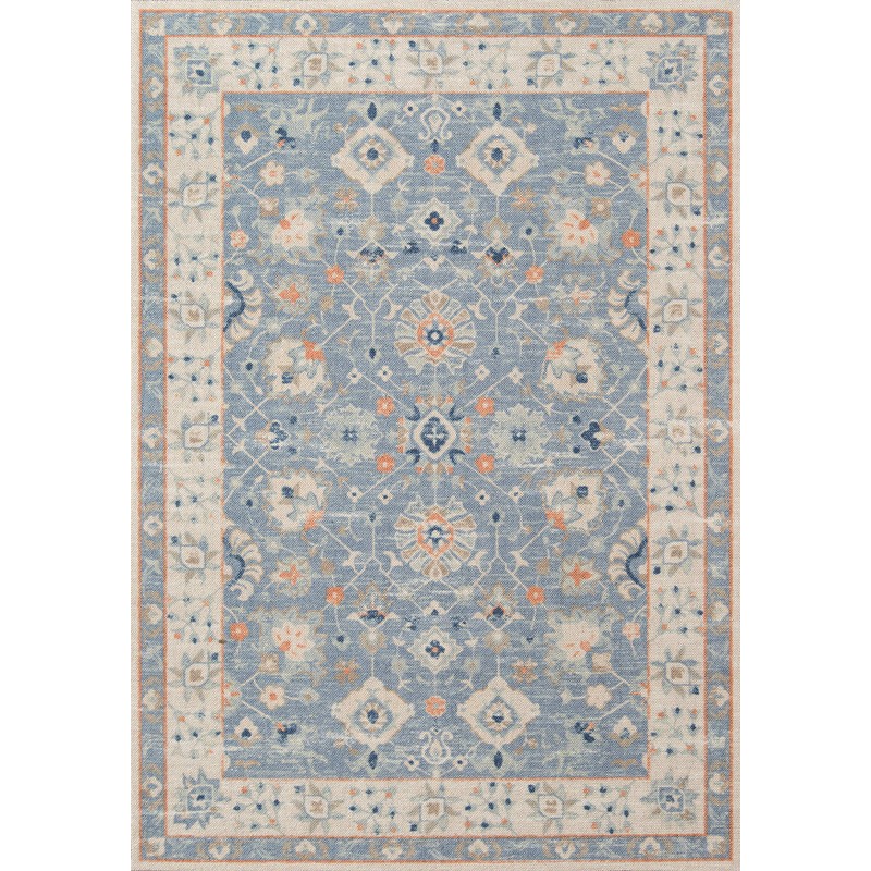 - Subdued shades of pink, baby Blue and brown fill the field and ornamental rug borders with classical medallions and vine and dot motifs