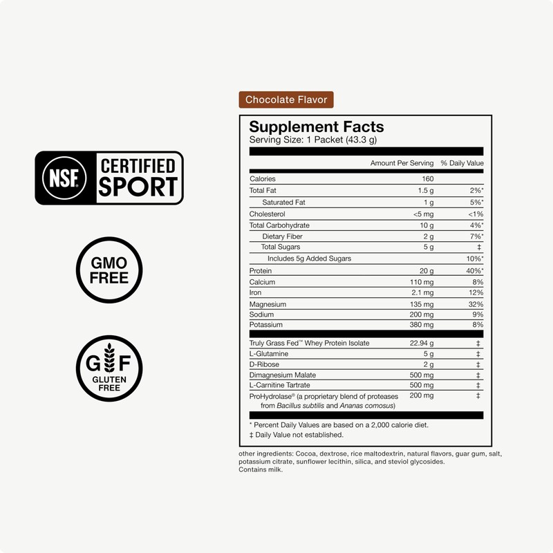 Momentous Recovery Grass-Fed Whey Protein Powder - 20 g Post-Workout Whey Isolate Protein - NSF Certified for Sport® - Gluten-Free - 15 Servings - Chocolate - Package May Vary