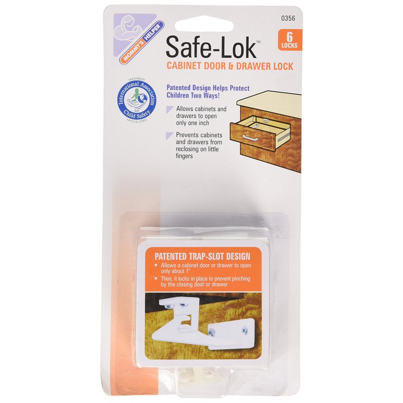 The Safe Lok's patented Trap Slot design helps protect children two ways. First, it allows a cabinet door or drawer to open only about 1". Then it locks in place so your child's fingers can't be p"ed by the closing door, while it remains easy for an adult to release. This contains 6 locks.