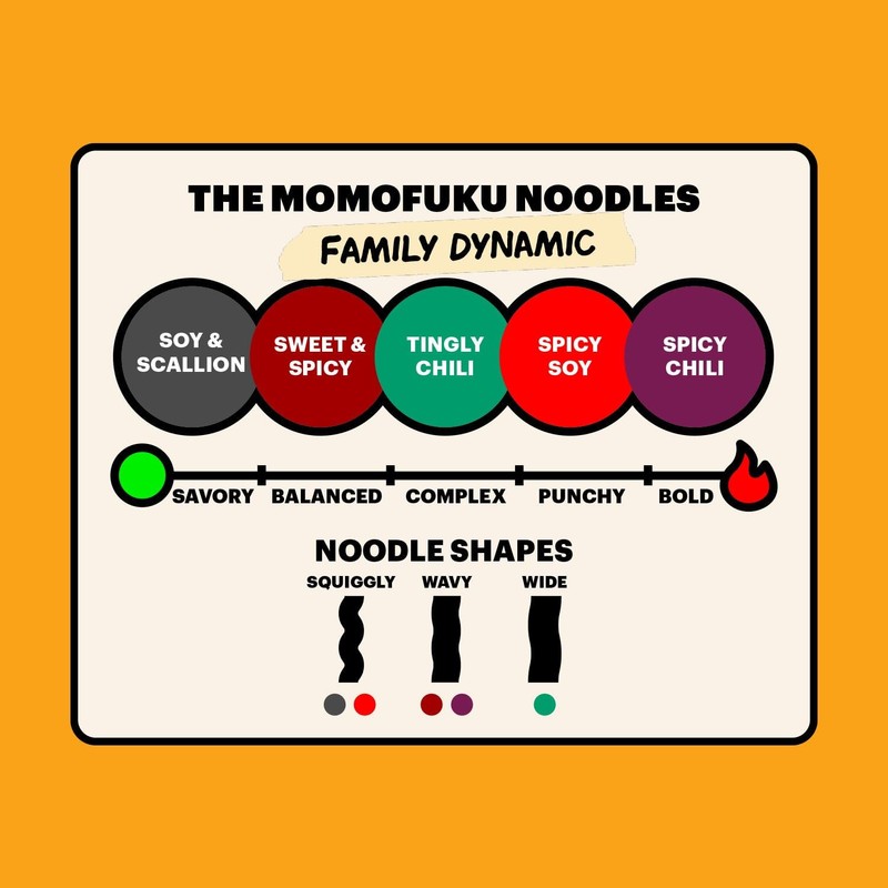- NEXT-GEN NOODLES | Momofuku Noodles from David Chang are made from simple, wholesome ingredients. Each pack contains 5 individually wrapped servings of each flavor: Soy & Scallion, Spicy Soy, Tingly Chili Wavy totalling to 15 meals.
