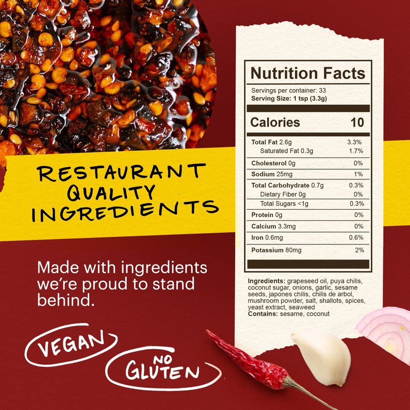 - ONLY THE GOOD STUFF | Chili Crunch is vegan, does not contain gluten, non-GMO, and made with ingredients we’re proud to stand behind.