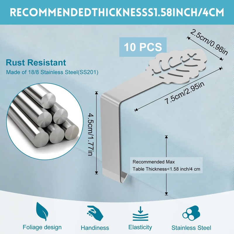 - Suitable for Different Table-Our metal table cloth holder clips are designed to fit different thicknesses table, making them suitable for a wide range of table sizes(max thickness 1.58 inches),perfect to fit various table such as rectangle tables, patio round tables, camping tables, square tables, and outside portable dining tables