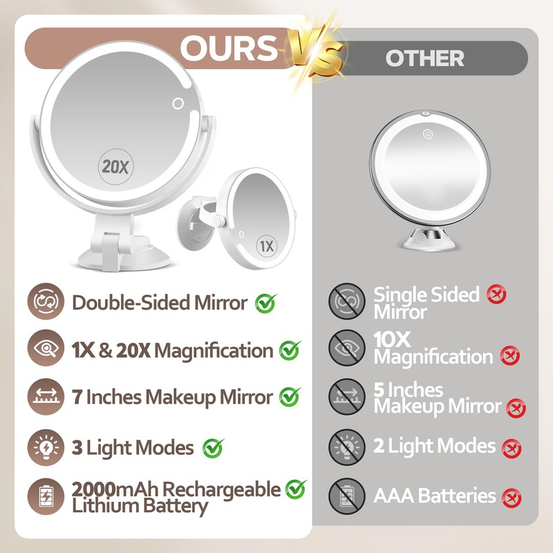 The MOMOKUBA LED mirror is here to meet all your needs. This lighted makeup mirror is ideal for use as a bathroom mirror, vanity mirror, or mirror for desk, offering precision and clarity every time.360° Adjustable Rotation & Powerful Suction Cup: Featuring 360° adjustable rotation and a powerful magnifying mirror suction cup, this mirror allows easy mounting on your bathroom mirror, glass surfaces, or other mirrors. Simply twist to lock it securely in place, ensuring a stable, wobble-free experience. Perfect for makeup, shaving, and skincare.20X Magnification for Precision: Equipped with both 1X and 20X magnification, this lighted makeup mirror is perfect for detailed tasks like eyebrow shaping, applying false lashes, or checking for blemishes. Whether perfecting your makeup or checking your skin, the mirror provides exceptional clarity and accuracy.Three Adjustable Lighting Modes with Stepless Dimming: Choose from three lighting modes—natural light for everyday makeup, warm light for a soft glow on date nights, and cool white light for tasks like eyebrow shaping or skincare. The stepless dimming feature lets you adjust the brightness to match your needs, whether as a bathroom mirror, vanity mirror, or mirror for desk.Rechargeable Battery for Long-Lasting Power: Say goodbye to constantly replacing batteries! This table mirror has a 2000mAh rechargeable battery, offering up to a week of use on a full charge. It charges quickly via USB-C in just 3 hours, providing long-lasting power for home or travel use.Ideal Gift for Makeup Lovers: This magnifying mirror with light makes the perfect gift for anyone who loves makeup. Whether used as a wall mounted makeup mirror in the bathroom or as a table mirror, it’s a thoughtful and practical gift for birthdays, Mother’s Day, or any special occasion.