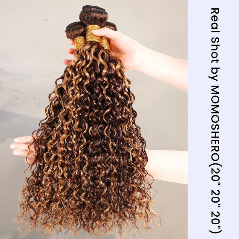 MOMOSHERO Highlight Water Wave Ombre Honey Blonde Curly Bundles, 4/27 Brown Highlighted Wet and Wavy Bundle Weave, Soft 12A 100% Virgin Hair 3 Bundles 12 14 16 Inch