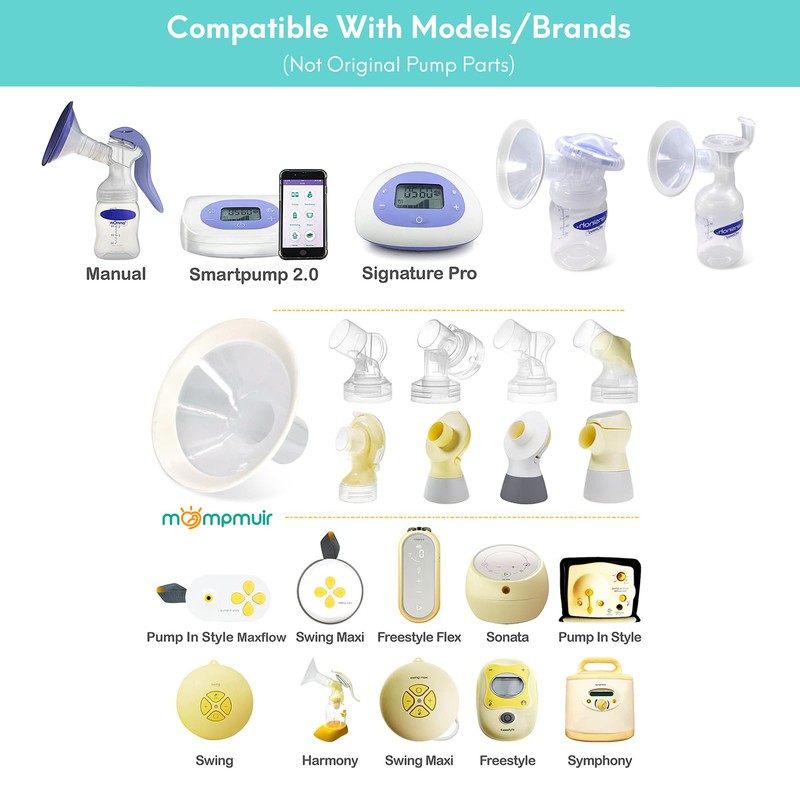 - CONTENT: 2 piece MompMuir 19mm breast shields compatible with Lansinoh Manual, Smartpump 2.0, Signature Pro pumps. And compatible with all Medela pumps (New Medela Pump in Style with MaxFlow, Pump in style Advanced, Lactina, Symphony, Swing, Swing Maxi, Mini Electric, FreeStyle, Swing Maxi, Sonata and Harmony, freestyle flex). And compatible with Spectra S1 S2 detachable flange.