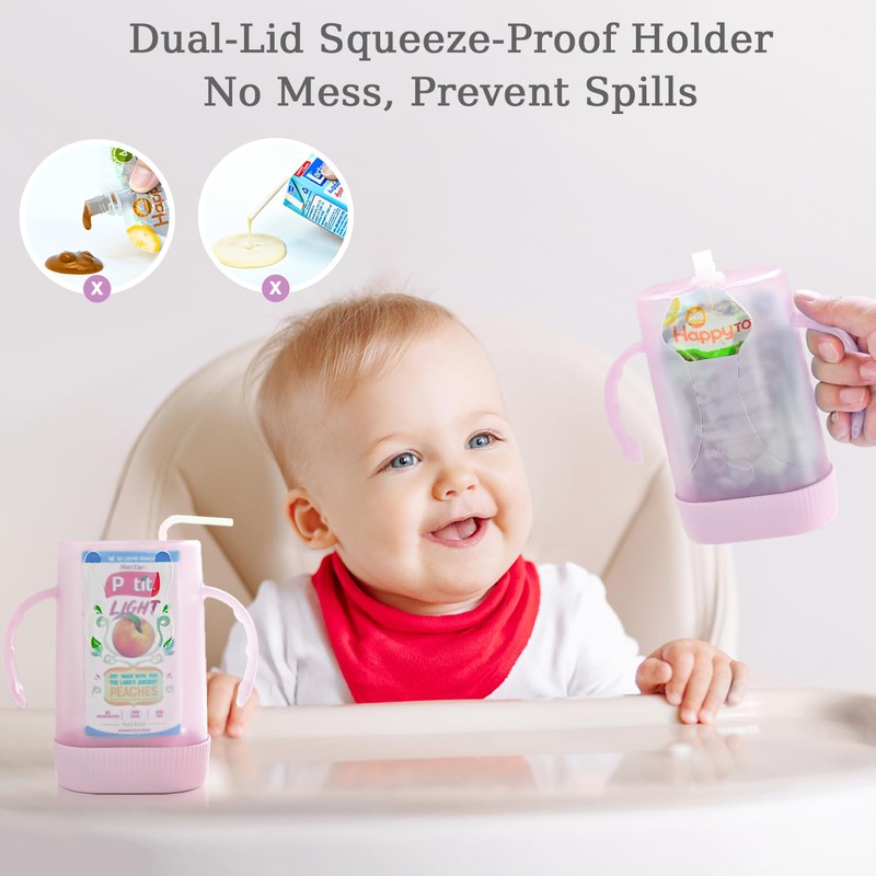 - No Squeezes & Mess: Does your baby want to eat by themselves but always ends up making a mess? This baby food pouch holder is a great helper. It is designed for purees and juices, ensuring they won't be squeezed out. Prevent spills on sofas, tables, cars, or public places. Let your baby self-feed without mess and waste