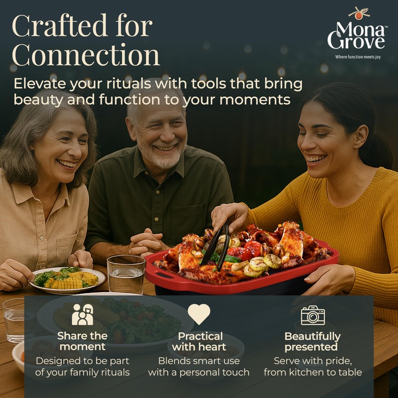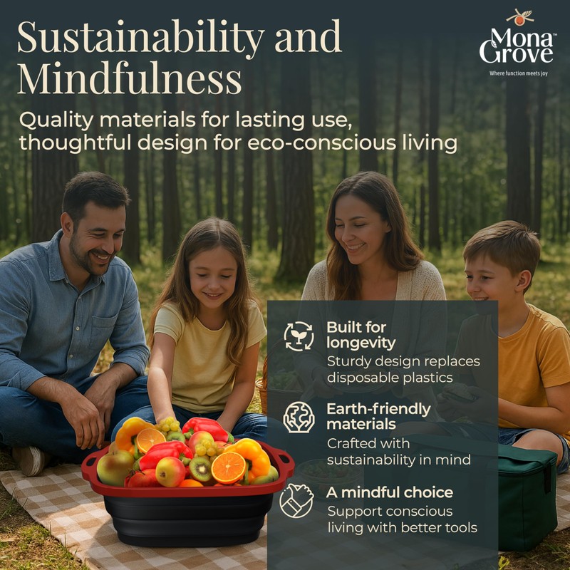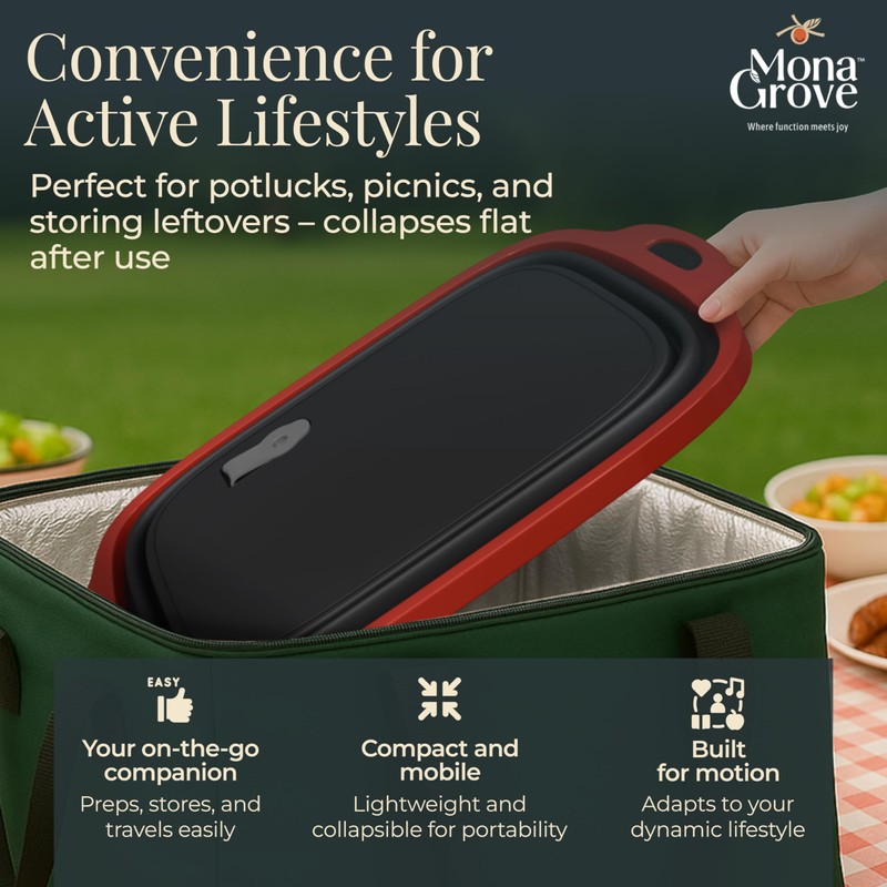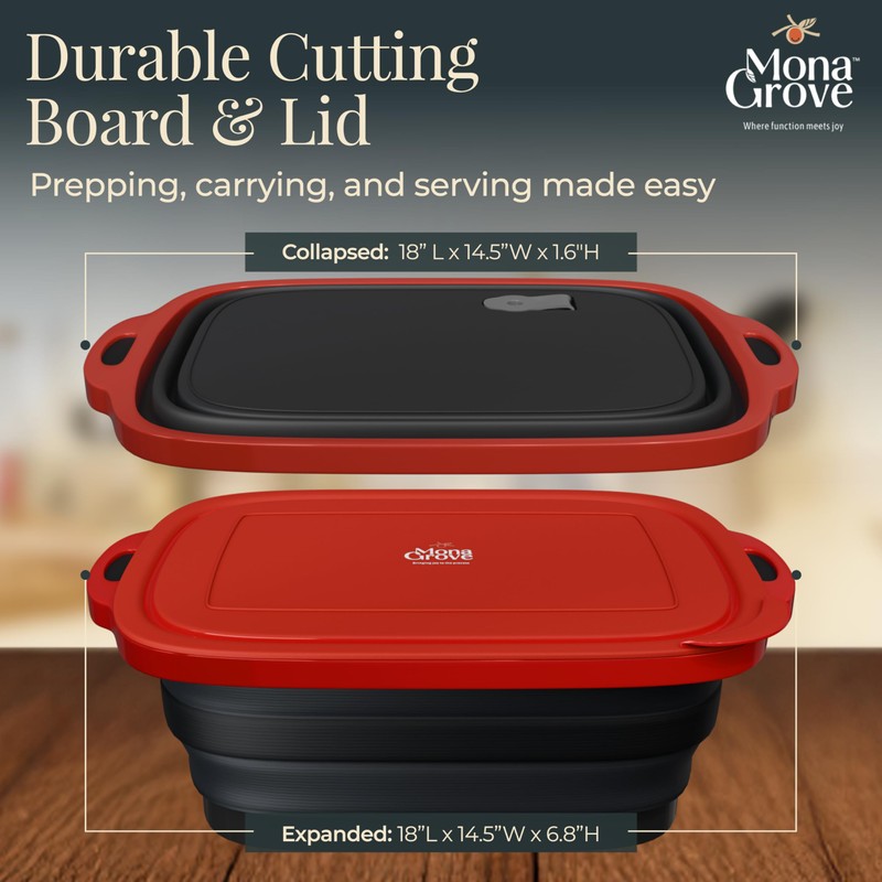 At Monagrove, we believe joy is found in the little everyday things. We believe that bringing joy to that present moment where we spend all of our time can have rippling positive effects to various aspects of our lives. Prepping a summer meal, grilling with loved ones, or organizing a space that simply works. Introducing our collapsible barbecue prep tub is designed to bring beauty and intention to these everyday tasks, a must-have for your indoor & outdoor cooking and food storage needs. Crafted for versatility, this thoughtfully engineered tub helps you simplify your routine wihtout sacrificing function or style. Use it as a marinating container for meats, a prep station for chopped vegetables, or a carry-all for your camping meals. The sturdy integrated cutting board adds an extra layer of usefulness - so you can prep, chop and cover, all in one go. The sturdy black container features a vibrant red lid with convenient handles on both sides for easy carrying and transport. The collapsible design makes it perfect for both storage and use, while the durable construction ensures it can handle your prep work with ease. The spacious interior provides ample room for marinating meats, storing ingredients, or keeping prepared foods fresh. The lid helps maintain freshness and prevents spills during transport, making it ideal for picnics or backyard barbecues.. Whether you're prepping ingredients ahead of time or storing leftovers, this practical container combines functionality with smart design. Made with durable, BPA-free materials, this prep tub collapses flat for easy storage in your kitchen drawers, camper bins or picnic bags. Whether you are cooking at home, grilling at the park or heading out for a weekend adventure, it's the multi-purpose kitchen tool you did not know you needed. Our design approach is rooted in our values of sustainability and mindfulness - choosing quality, lasting materials over throwaway convenience. The earthy tones and clean design language of our brand reflect our belief that practicality and aesthetics should always go hand in hand. This is more than just a container - it is a tool for those who savour life's simple rituals. Make space for what matters. Prep with joy.