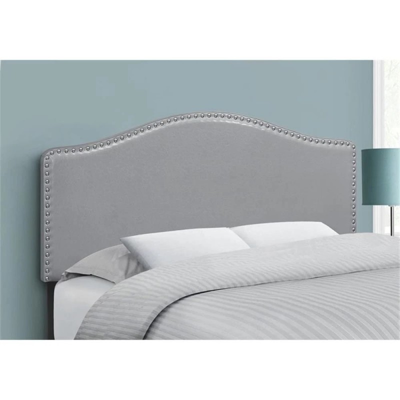 - Upholstered arched top headboard in a gray leather-look fabric with chrome-finish nailhead trim