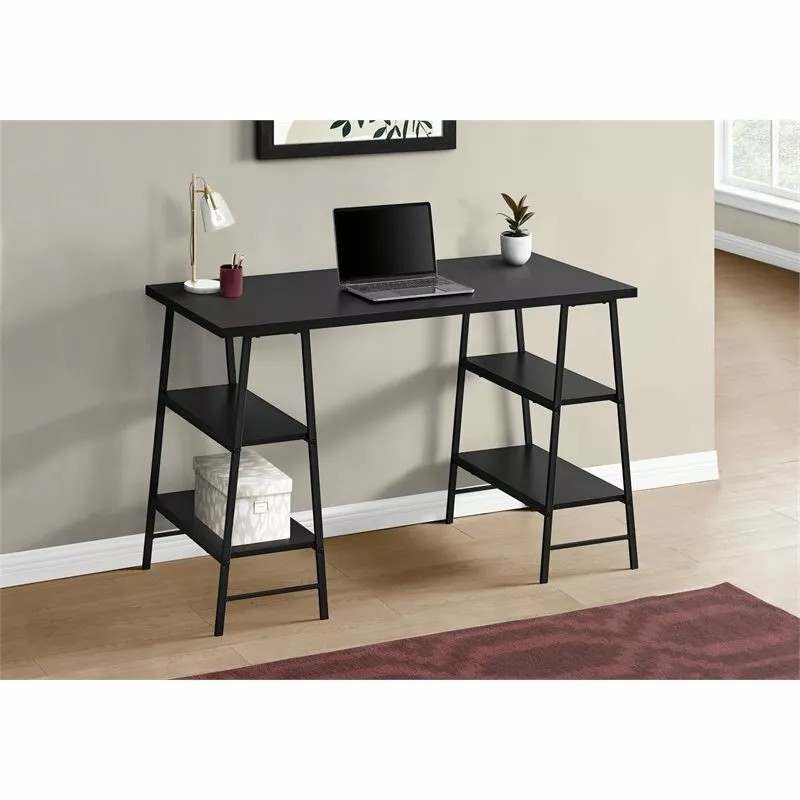 - Industrial-style computer desk with 4 fixed, open shelves supported by sawhorse-style legs in a black metal finish