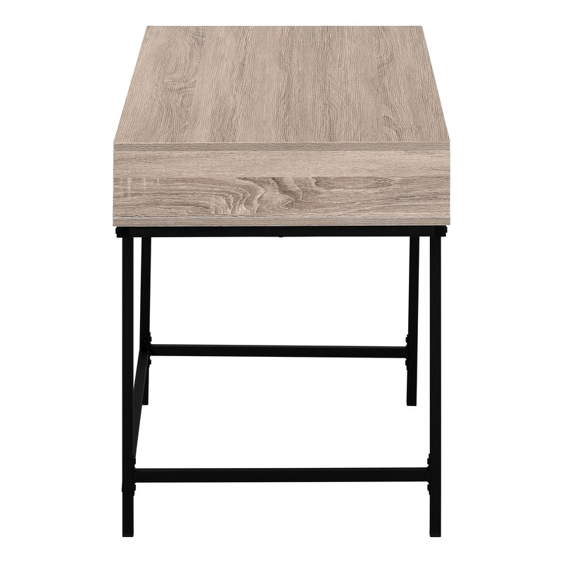 - MODERN STYLE - This computer desk with storage is finished in a dark taupe wood-look laminate and supported by a sturdy metal base in a contrasting black finish; the slim metal legs are recessed under the sizeable top for a distinctive look