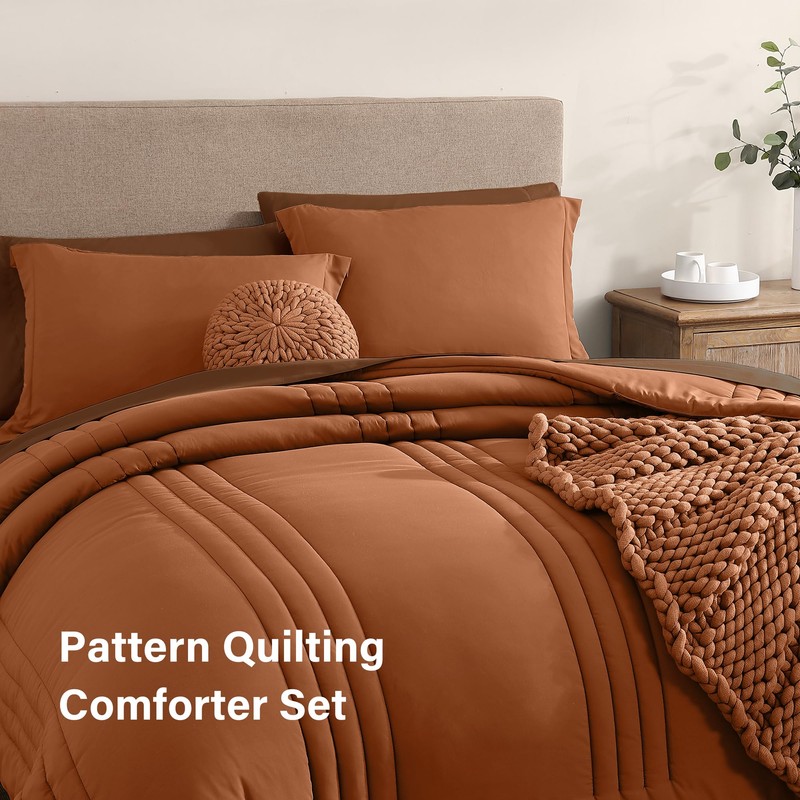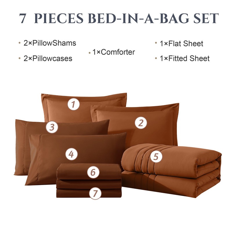 Monbix Comforter King Size, King Comforters Set 7 Piece, Breathable Solid Bedding Sets King with Comforters, King Bed in A Bag with Sheets,Pillowcases & Shams (Burnt Orange, 102"x90")
