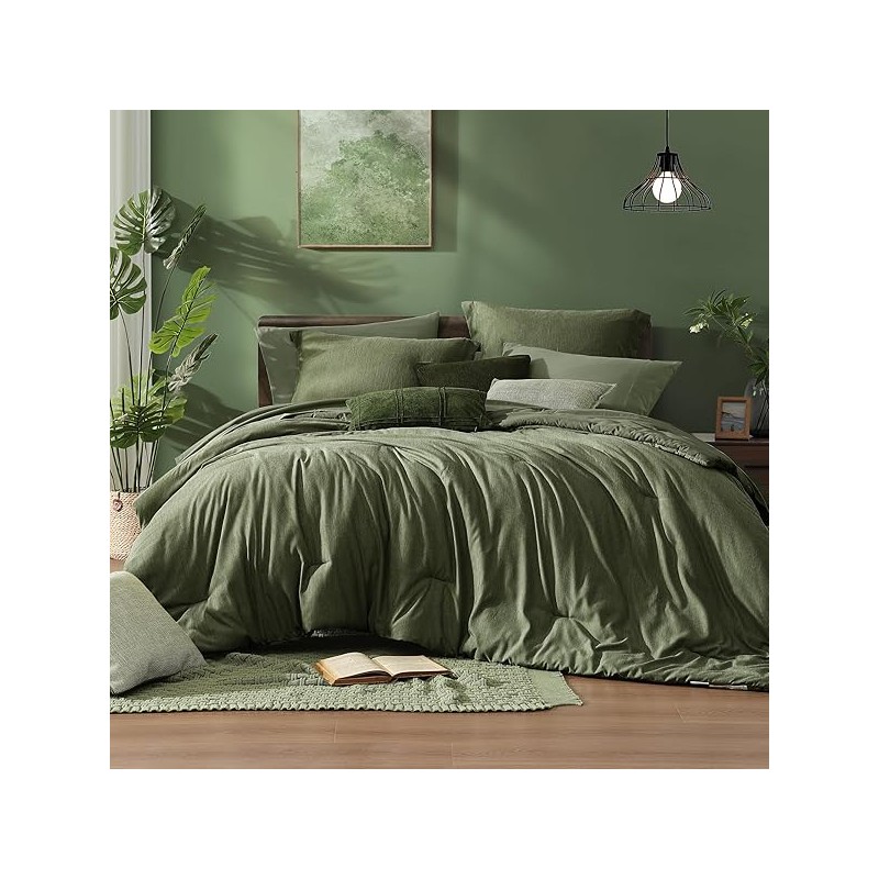 Monbix Queen Comforter Set - 7 Pieces Cationic Dyeing Olive Green Bed in a Bag Queen Bedding Sets with Comforter, Sheets, Pillowcases & Shams, Reversible Bedding Comforters Sets