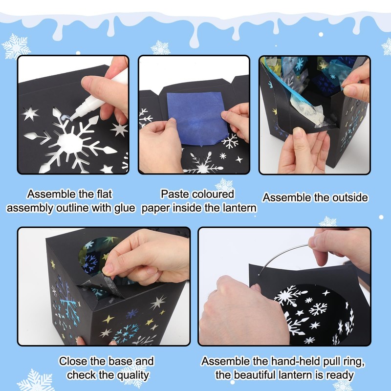 - Easy to Use: Our snowflake lantern craft kit is easy for kids to create, as they simply glue the colored cellophane pieces onto the pre-cut cards,and then assemble the lanterns(You can refer to the steps in the picture). Add an electric tealight and watch these snow lantern come alive. The lantern is equipped with a metal carrying handle,so you can hang it everywhere