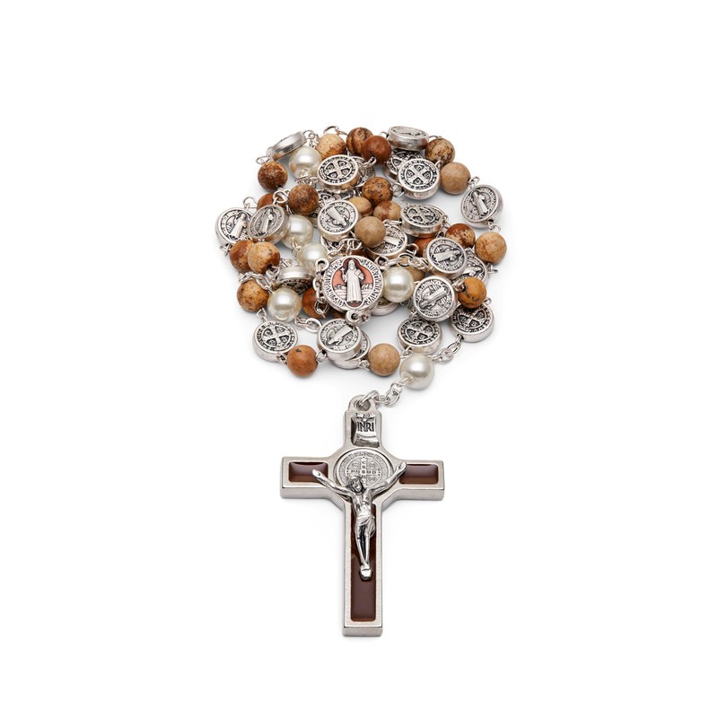 - 👌[PREMIUM QUALITY ROSARY] The material of the centerpiece is high-quality Zamak with brown enamel. This wonderful St. Benedict rosary is made with real stone. The rosary catholic is composed of five decades of beads, with an enameled Zamak crucifix containing St. Benedict’s medal.
