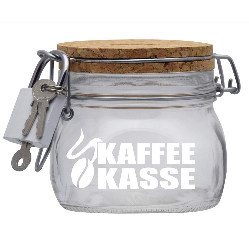 • Glass money box contents: 10 x 10 x 10 cm equivalent to 0.5 litre volume, cork lid with economy slot, padlock with 3 keys. With a money box to write on yourself, you will also receive a branded chalk. Lightly moisten the chalk for better labelling. Normal water is suitable for cleaning.