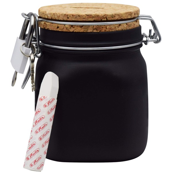 - Glass money box contents: 14 x 10 x 10 cm corresponds to 0.75 litre volume, cork lid with economy slot, padlock with 3 keys. With a money box to write on yourself, you will also receive a branded chalk. Lightly moisten the chalk for better labelling. Normal water is suitable for cleaning.