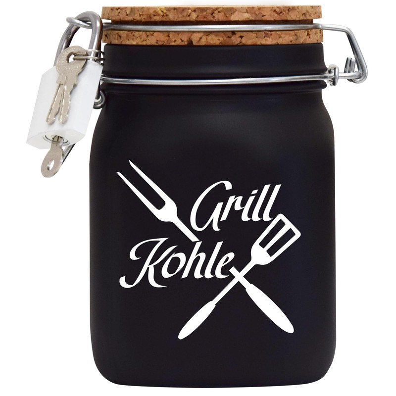 - Glass money box contents: 16 x 10 x 10 cm corresponds to 1 litre volume, cork lid with economy slot, padlock with 3 keys. With a money box to write on yourself, you will also receive a branded chalk. Lightly moisten the chalk for better labelling. Normal water is suitable for cleaning.