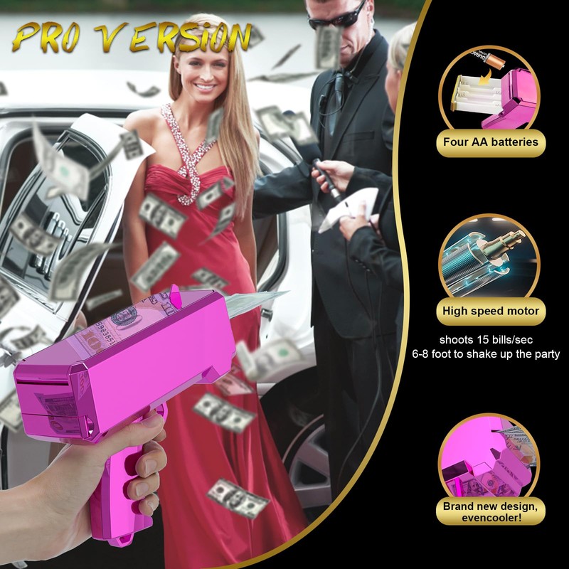 - 【Easy To Use】: The cash gun has stronger motor so it can shot a fully load cash smoothly at a rapid rate. It's also simple to use. Install 4 AA batteries into the gun right side before use. Lift the cover and put in your play cards or copy money, and then press the cover inside the body, point the gun slightly up towards the sky and pull the trigger in small bursts. The loaded money will come flying out. If the money gun is fired downward, the money may piled up and it may not come out well.