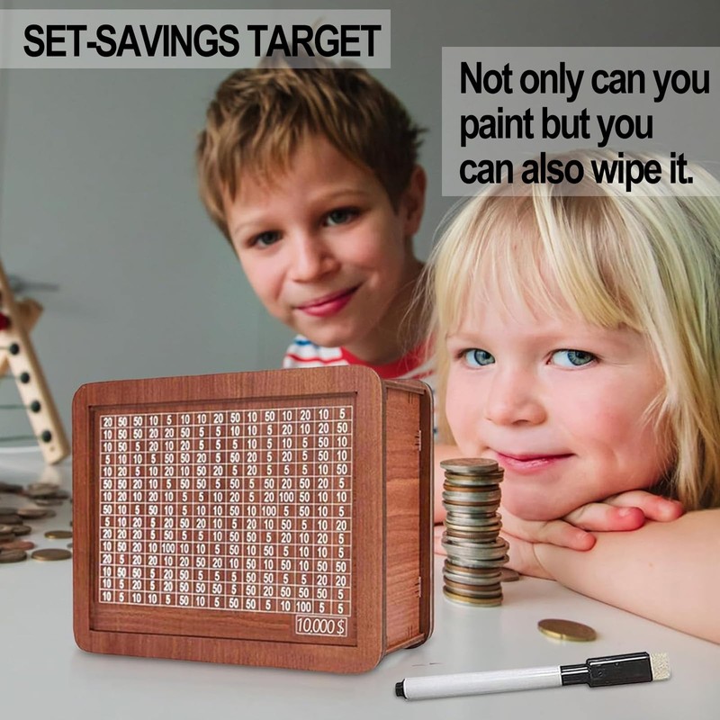 - 【Practical Design】This wooden Wooden coin bank features a built in counting tool that keeps track of the placed. To achieve the goal of 10000 dollars, you need to pay the amount printed on the box and tick the amount you pay in your money pot, and when all boxes are crossed, you have achieved your destination.