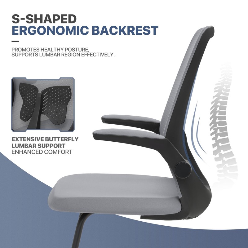 MoNiBloom Office Guest Chair Without Wheels, Executive Reception Chair with Lumbar Support and Sled Base, Mid-Back Mesh Task Chair with Flip-Up Arms for Reception Conference Wait Room, 250 LBS, Gray